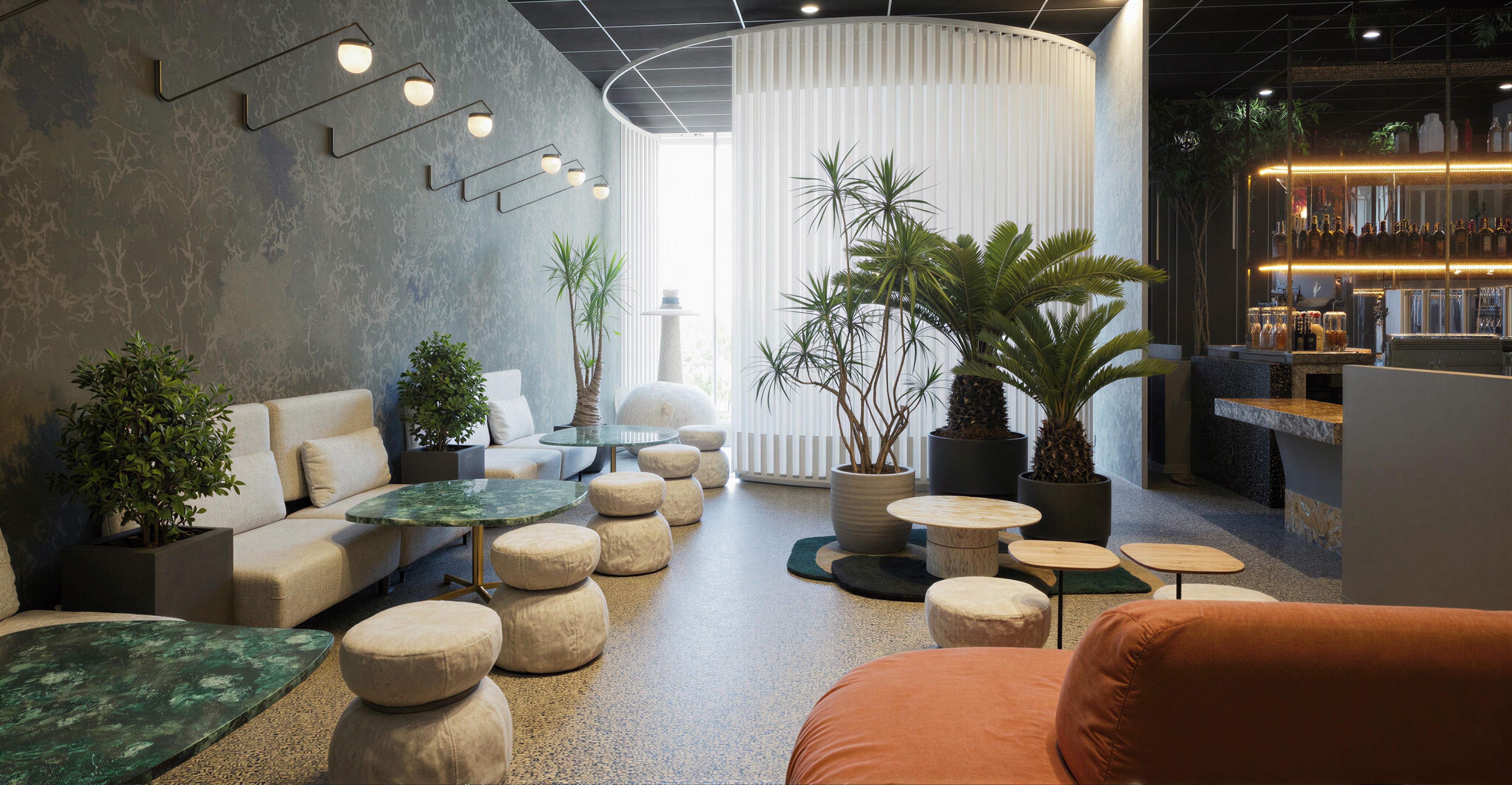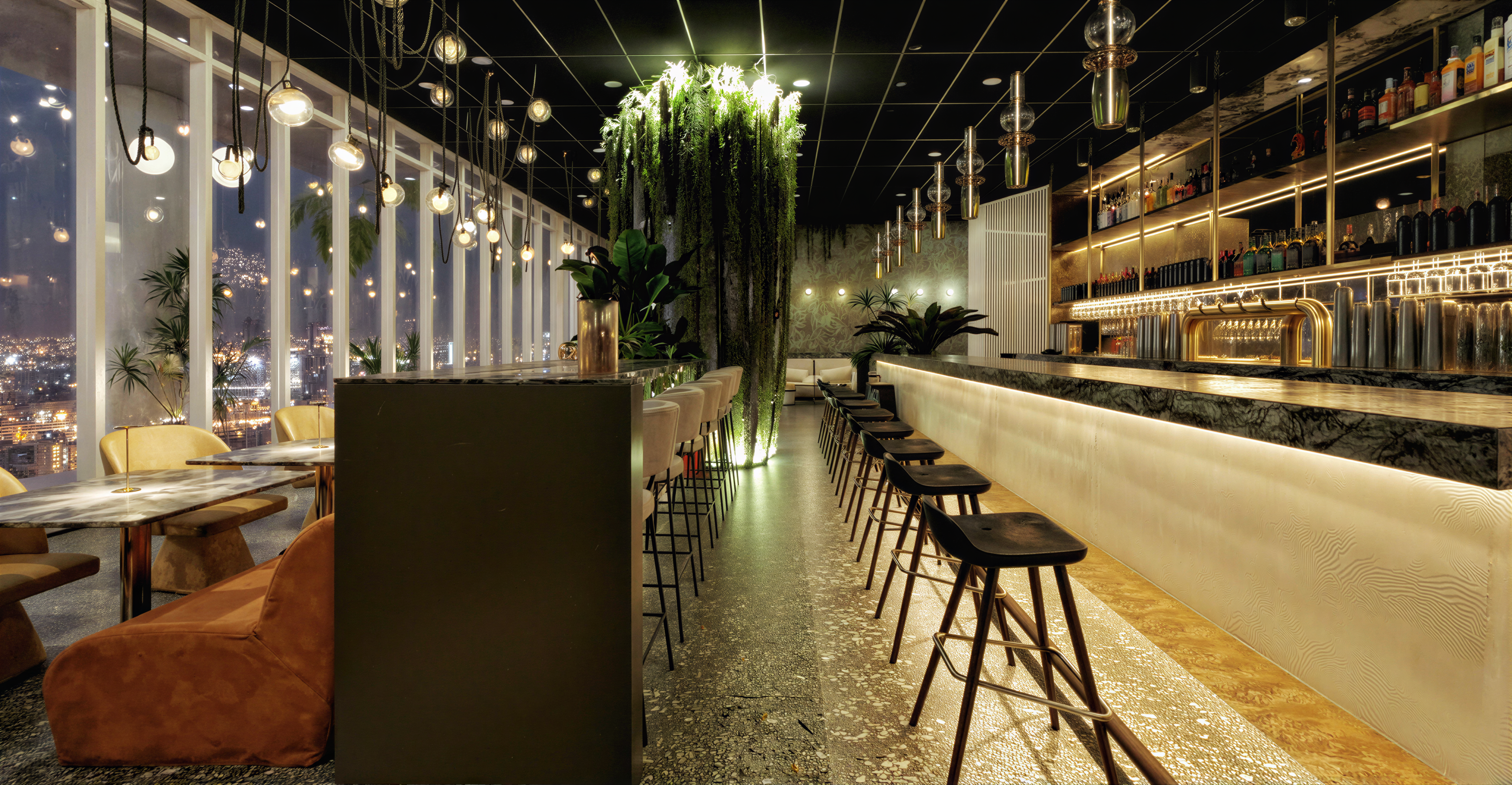Extending the experience outdoors, a large panoramic terrace forms a key element of the project. Designed as a lush urban retreat, the terrace incorporates generous green areas, landscaped planters, and natural textures that soften the architectural setting. Distinct zones for cocktail service, relaxed lounging, and seated dining allow guests to enjoy the views in a variety of settings, all while feeling immersed in a serene, open-air environment high above the city.