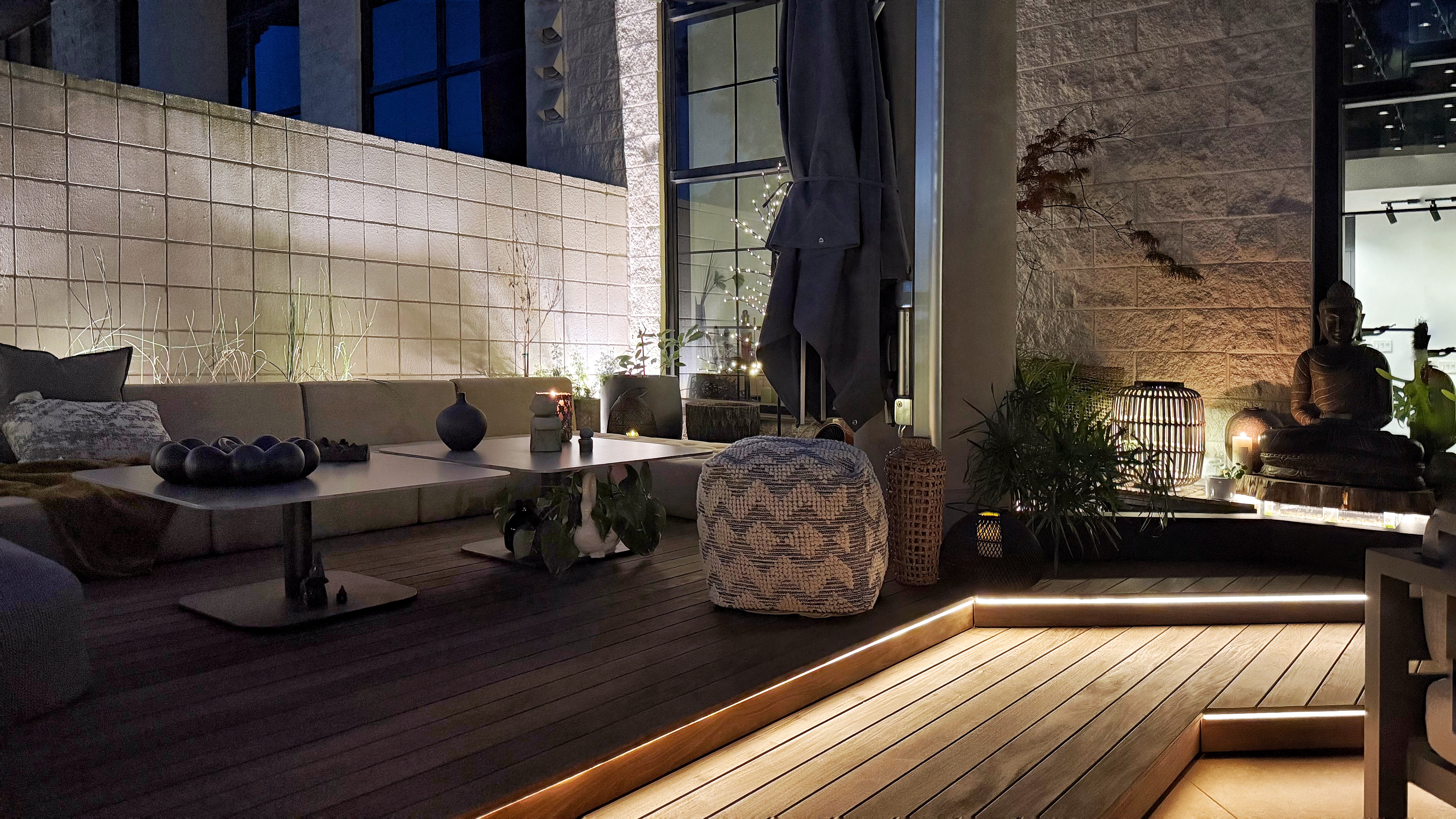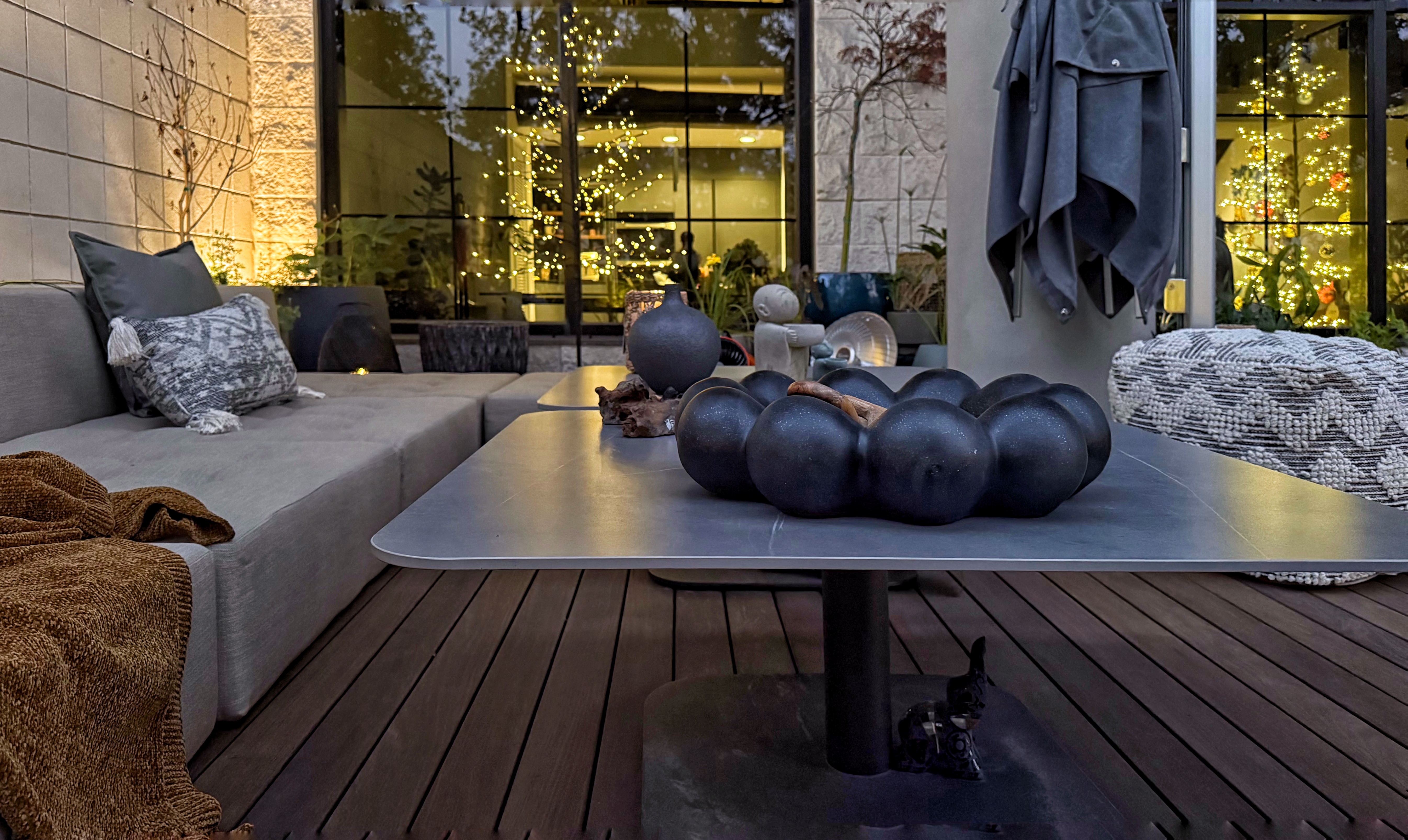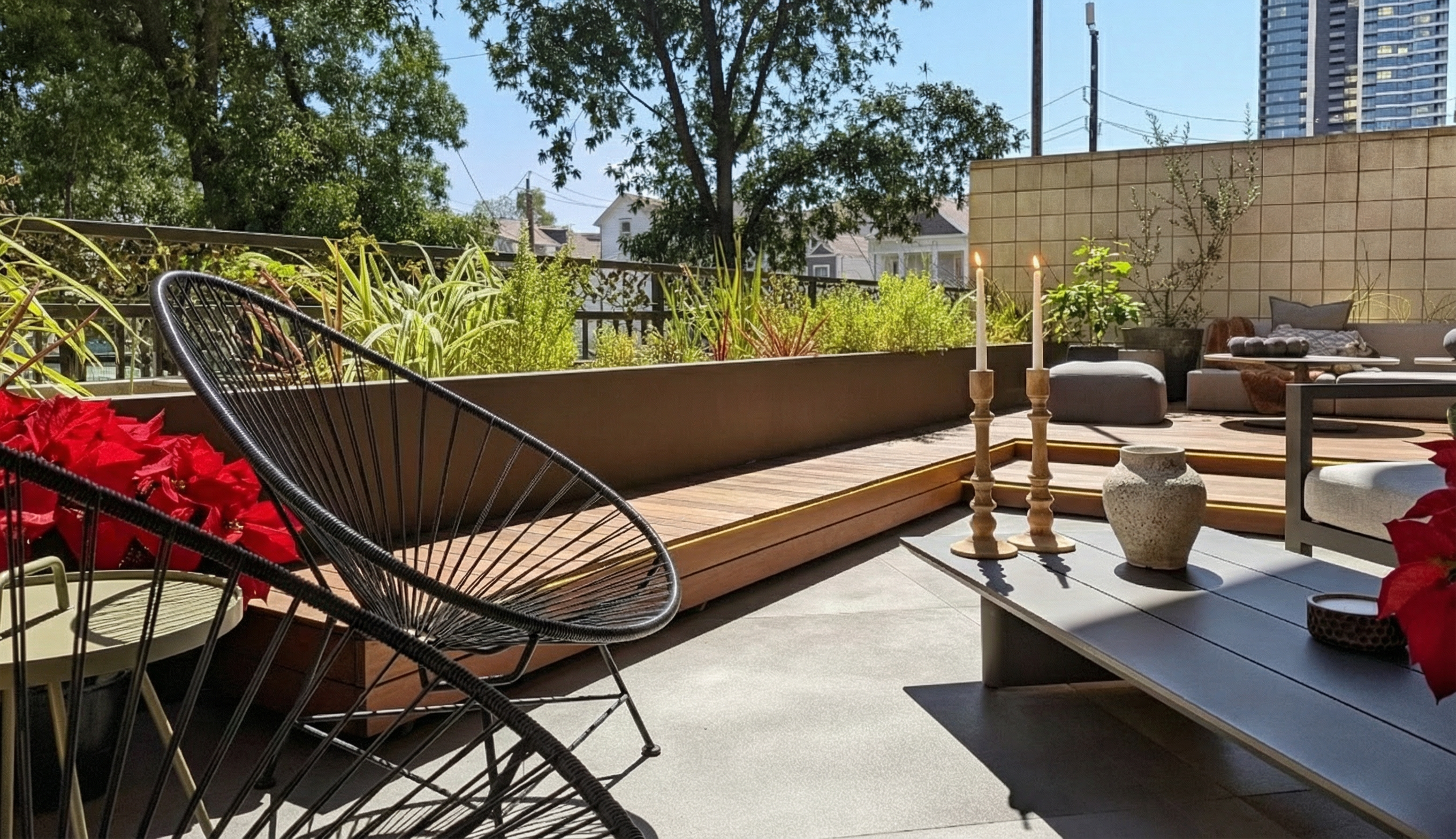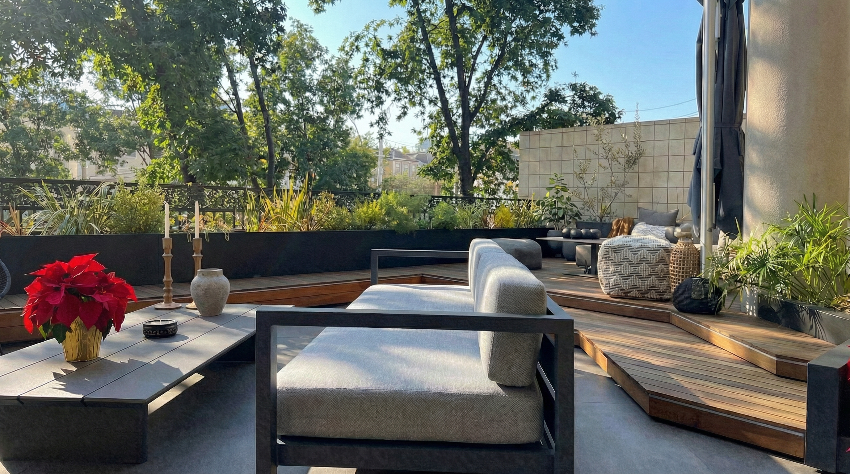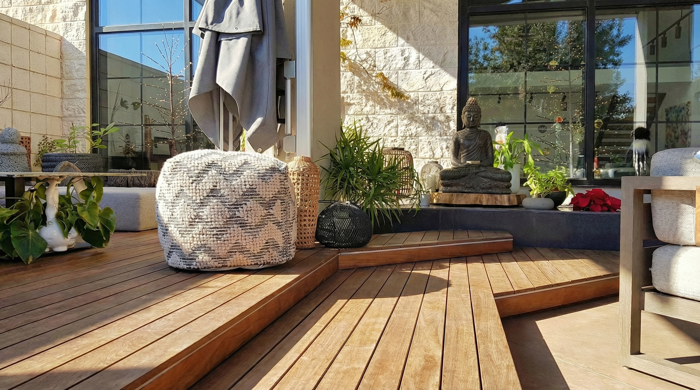 Beneath your feet lies a meticulously crafted wooden deck, its warm, honey-toned planks inviting you to linger and soak in the tranquil ambiance. The wood, polished to a smooth finish, exudes a natural elegance that complements the organic beauty of the plants.
