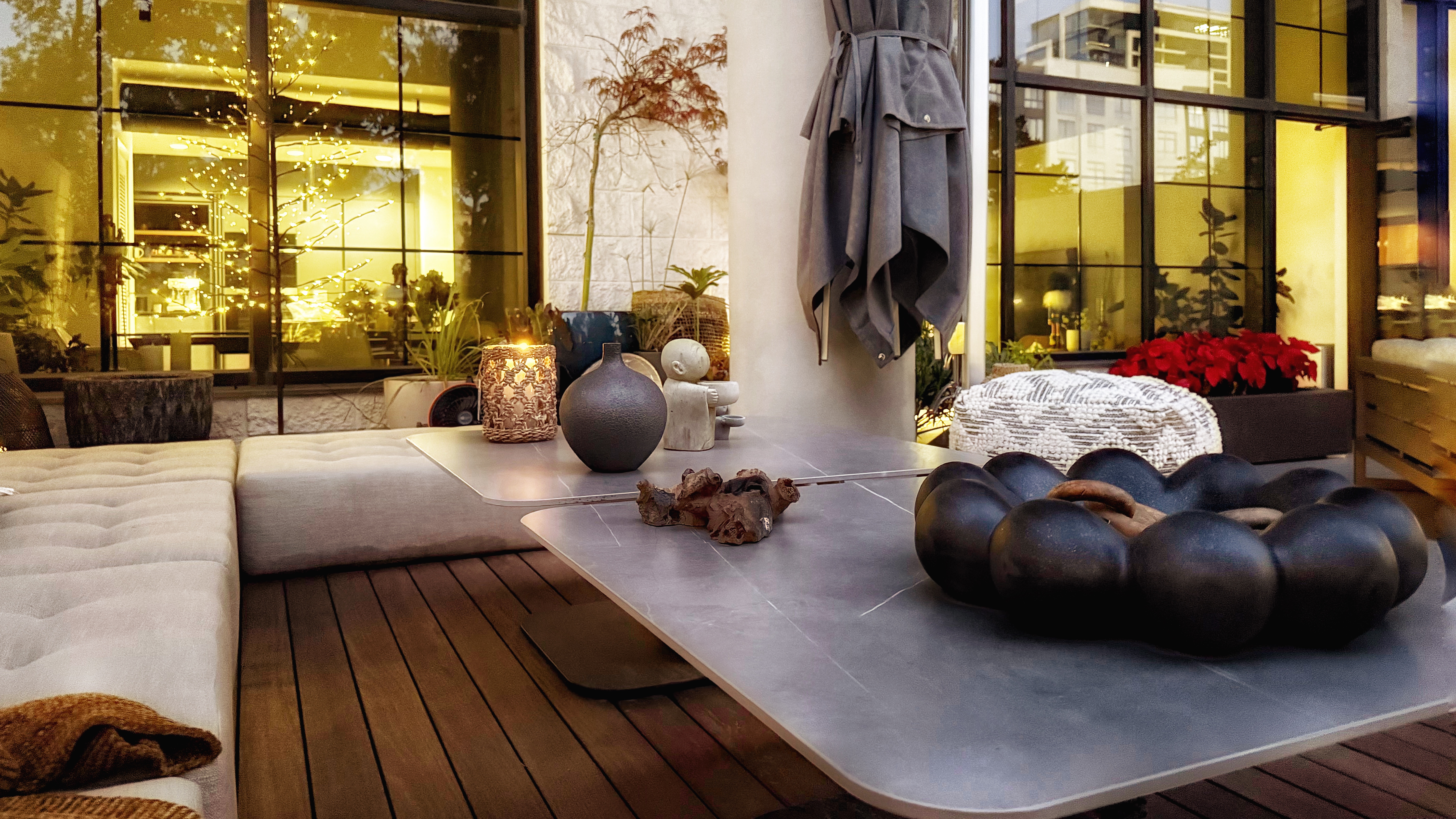 At the far end of the balcony, a cozy seating area beckons with plush cushions and oversized pillows, arranged in a circular formation around a low coffee table. Here, you can unwind with a book, sip a cup of tea, or simply bask in the soothing sounds of nature.