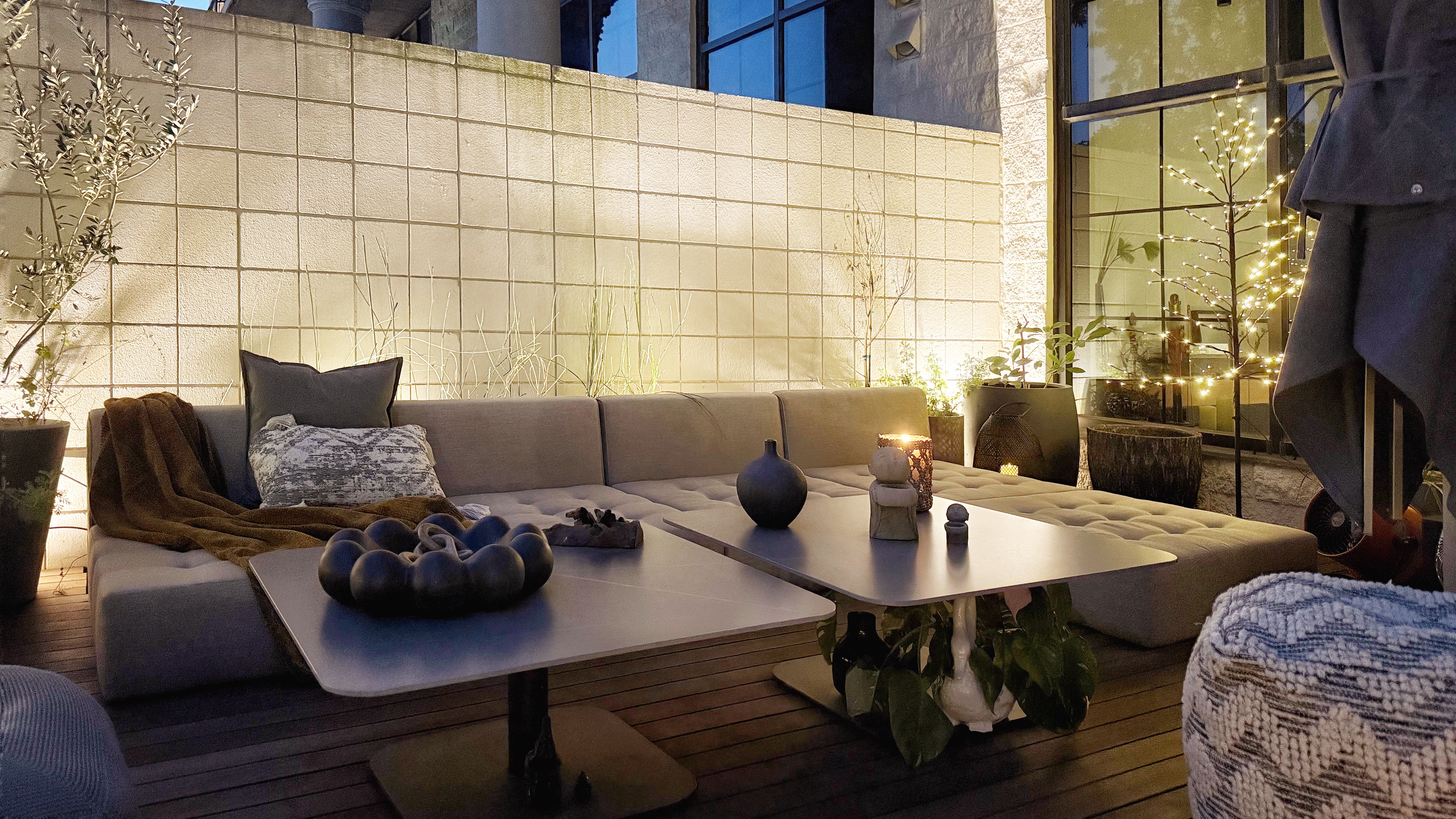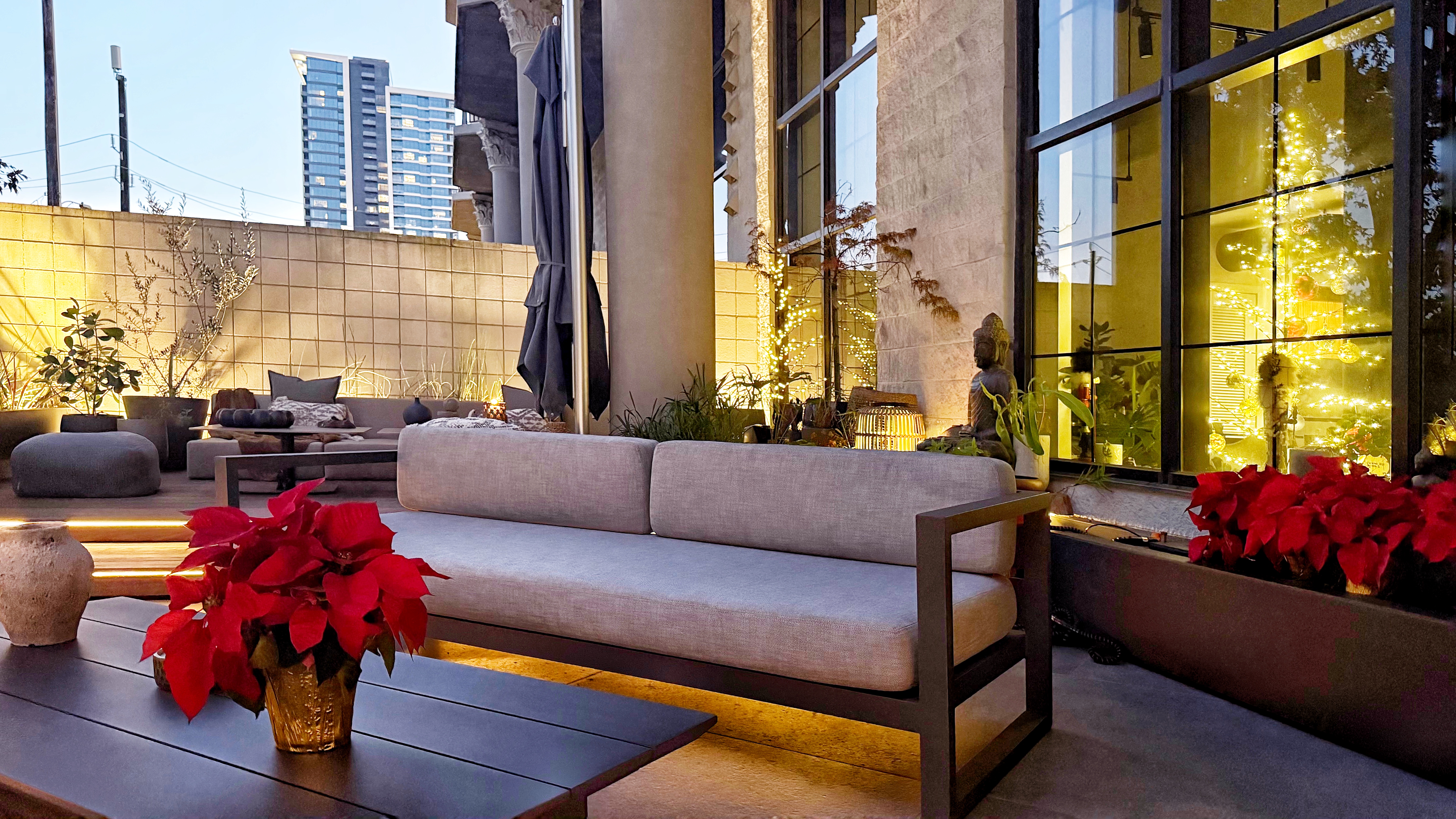 Soft, ambient lighting casts a gentle glow over the scene, enhancing the tranquility of the space as the sun begins to dip below the horizon. Twinkling fairy lights are delicately woven through the foliage, casting a magical aura that dances with the shadows of the leaves.