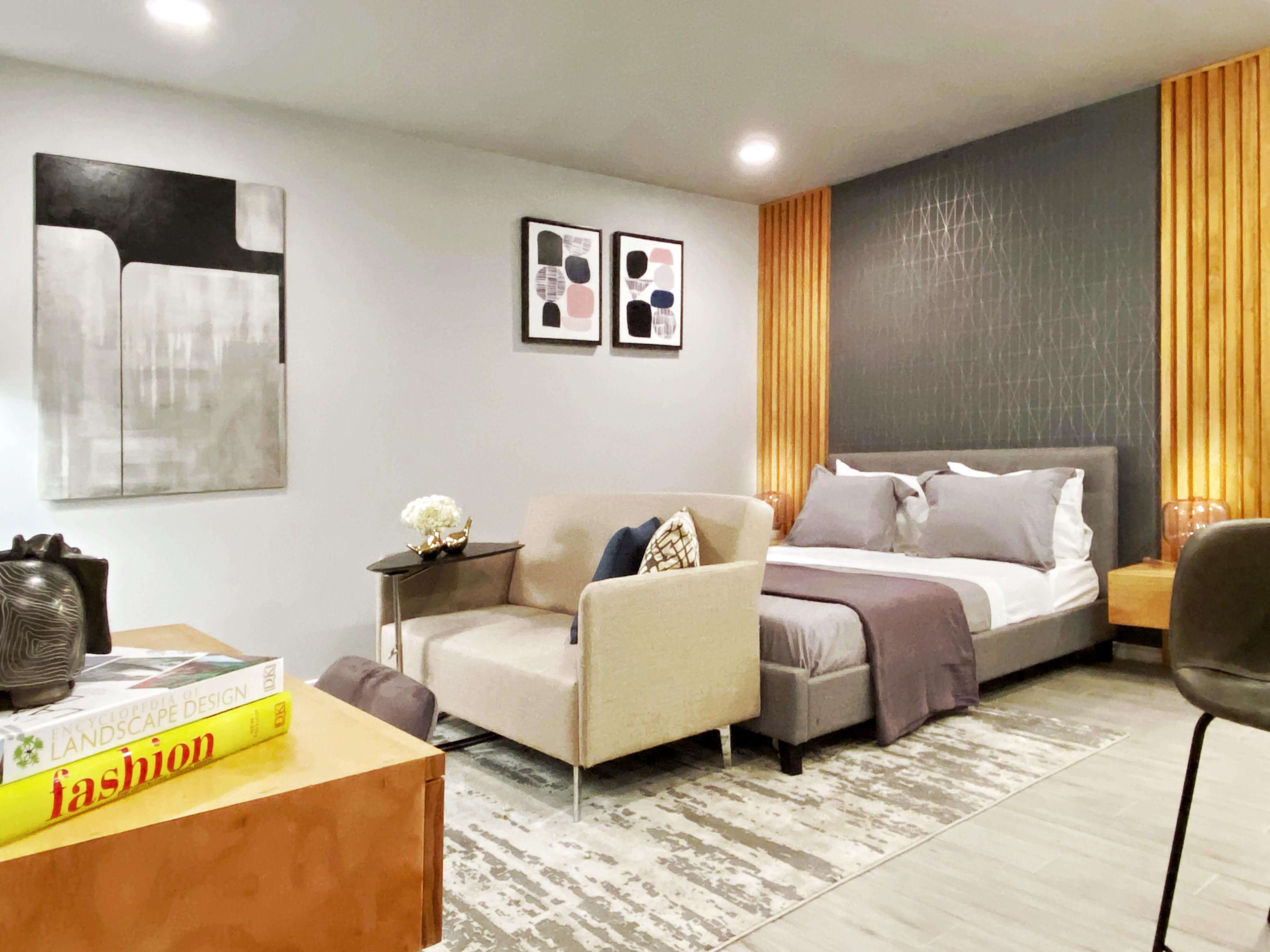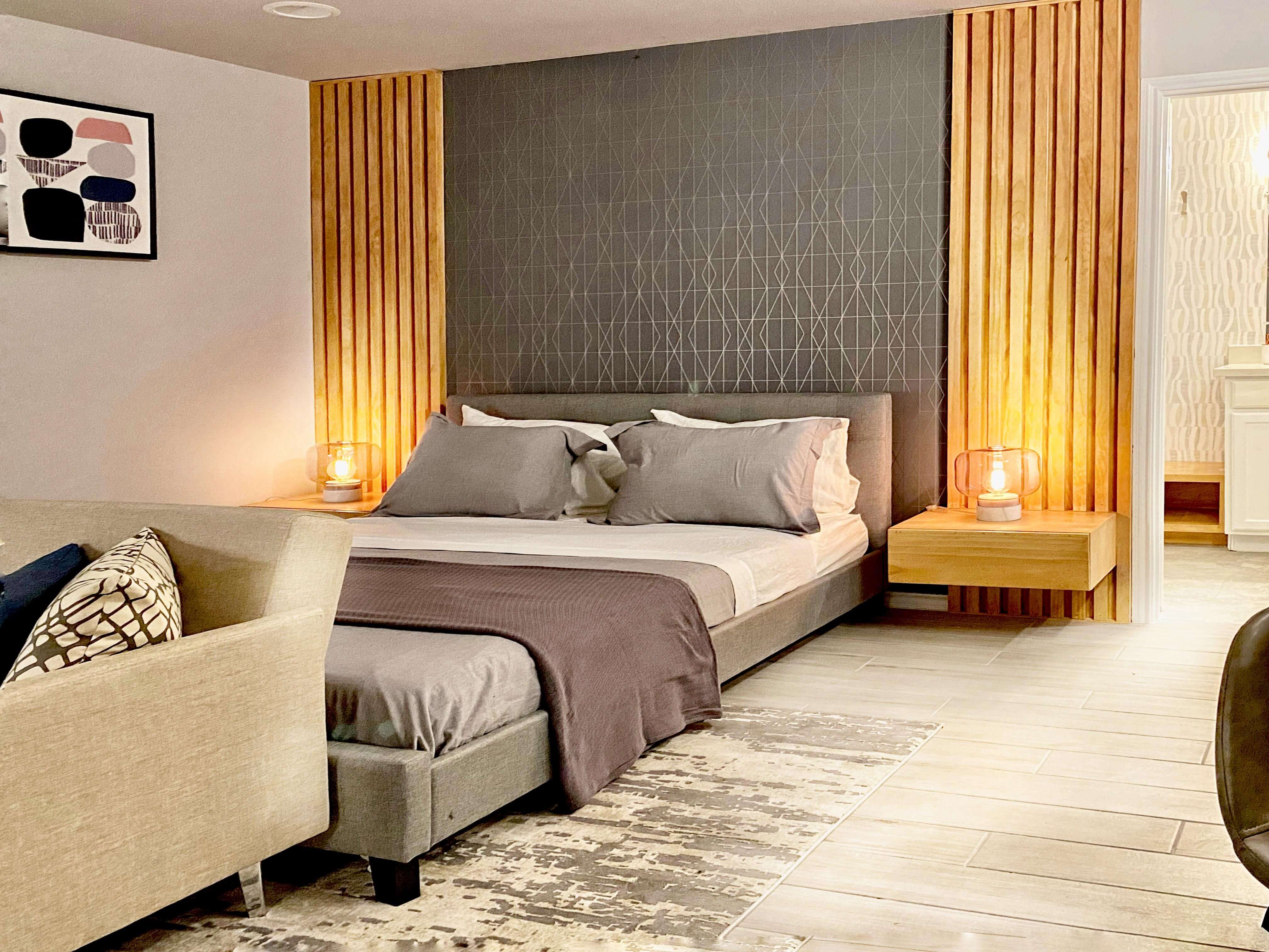 The queen bed, featuring a stunning wood slats headboard with attached nightstand, promises a unique and attractive experience. Relax on the lower sofa while enjoying the entertainment from the strategically placed TV unit and side table.