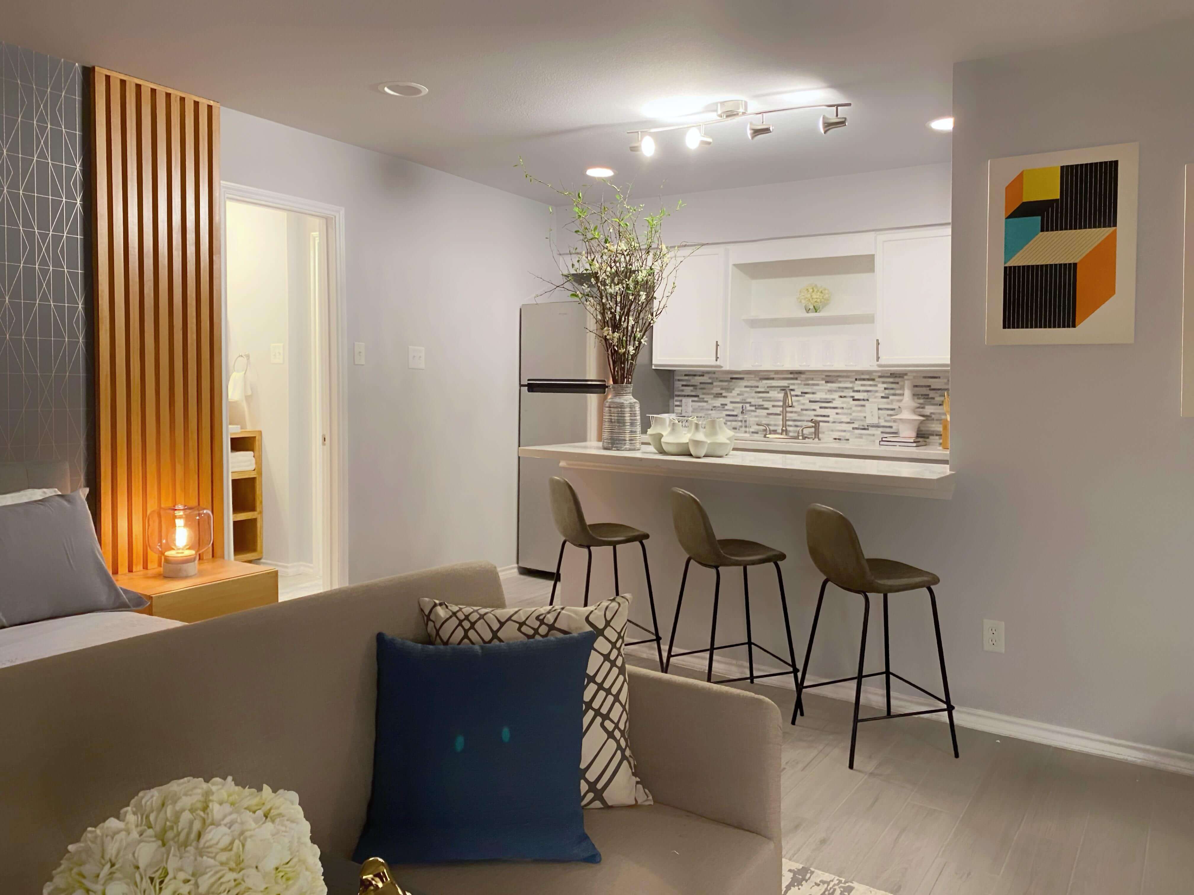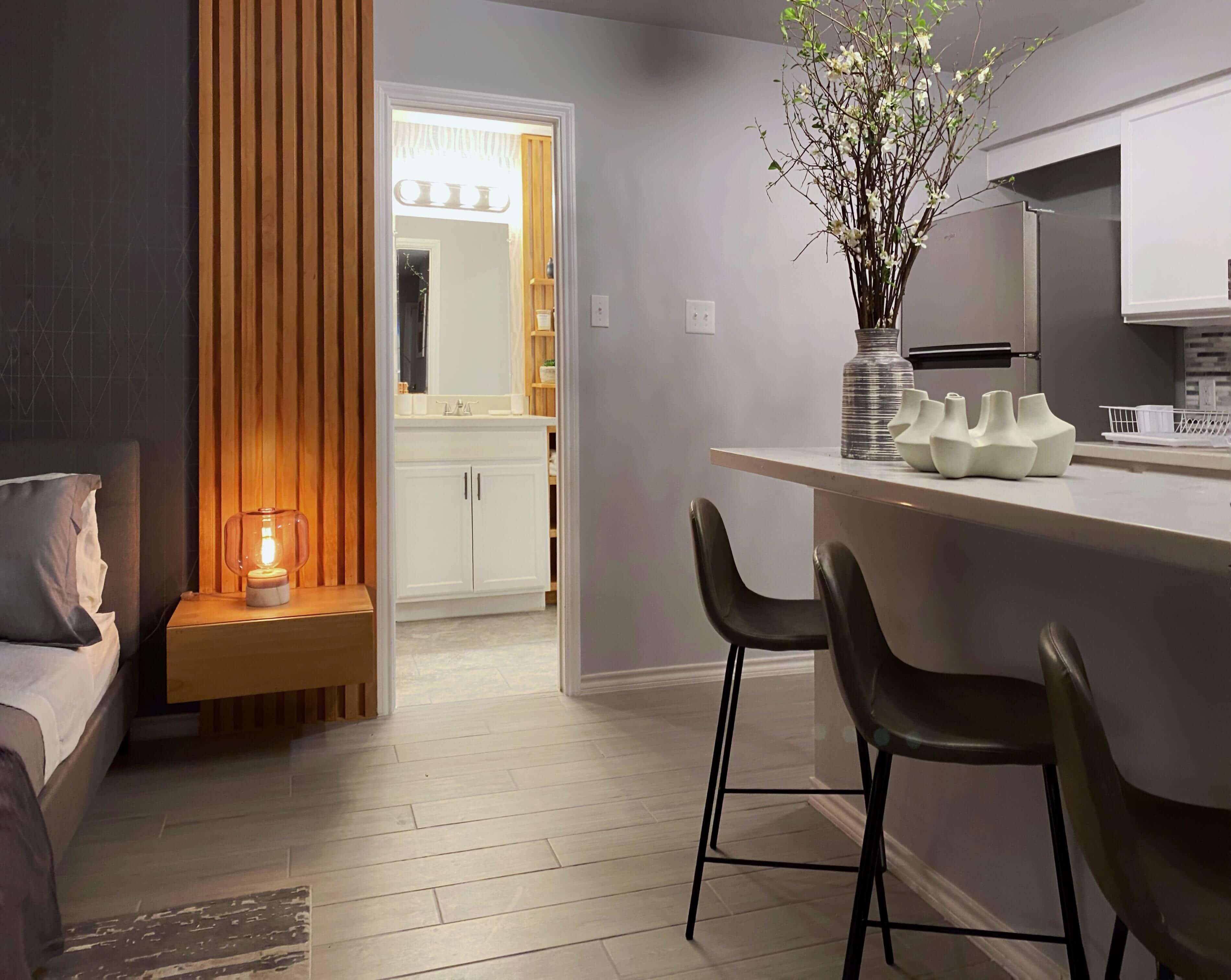 The open kitchen area seamlessly integrates with the rest of the space, allowing tenants to savor every meal at the chic bar high table. Whether it's breakfast, lunch, or dinner, you'll relish every moment spent in this inviting space.